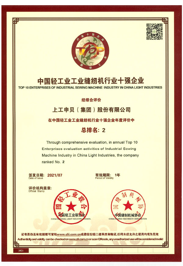 j9真人第一品牌(集团)股份有限公司入选中国轻工业工业缝纫机行业十强(第2名)